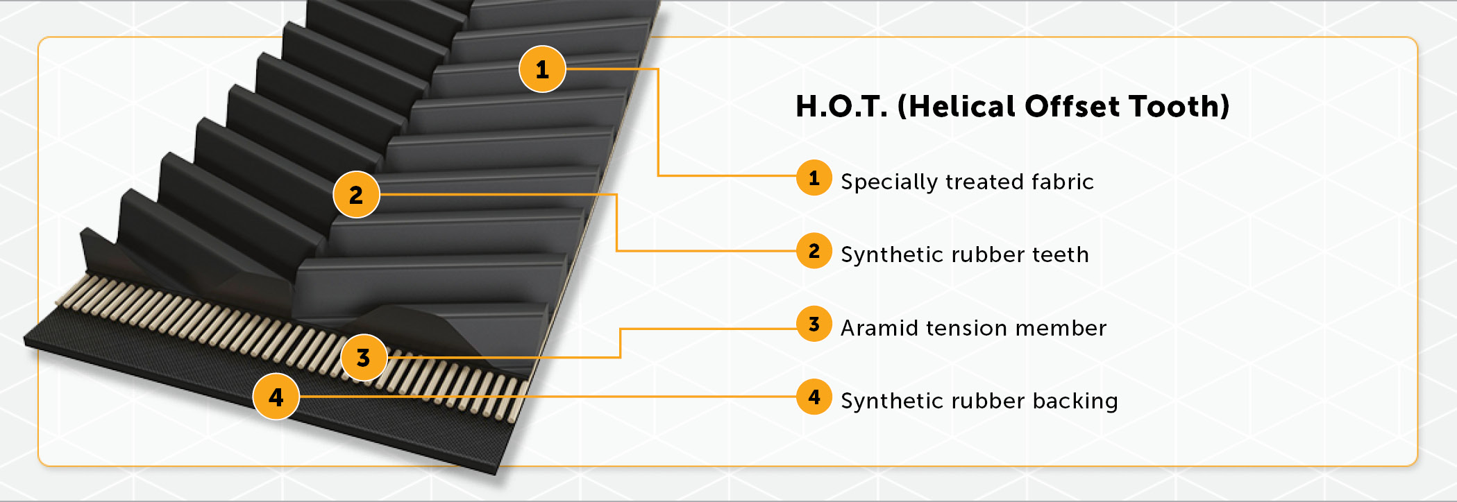 The teeth are molded from synthetic rubber and then made wear-resistant with a specially treated polyamide fabric. The belt backing is made of the same rubber, with a polyester fabric, making it highly flexible for reverse flexing.