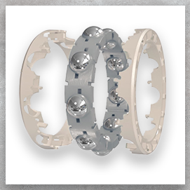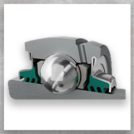 Two-piece design creates a grease compartment around each ball element, decreasing the need for frequent relubrication